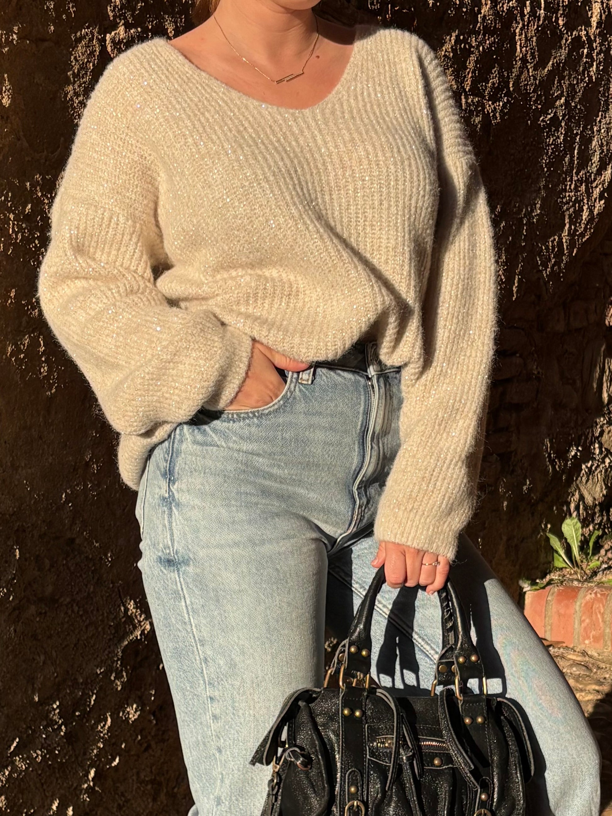 - Détails : Pull col en V avec des détails brillants